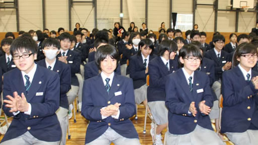 佐々木市長は、「希望の松と閖上小・中に咲いていたサクラをモチーフにしていただいて非常にうれしい。先生との出会いを大切にし、みんなで立ち上がって未来を切り開いていきましょう。私も、安心して暮らせる街の復興に必至で取り組みます」と応えた。 また、陳氏は「今回の震災に際し改めて心からお見舞い申し上げます。私は四川省で起きた地震のときも日本の救援隊と一緒に現地に駆けつけました。人間の絆がとても大切なことを学びました。中国の政府も大使館も総領事館 も復興へのサポートをしていきたいと考えています。このような文化交流を深め、近くて近い仲 になるよう望んでいます。落ち着かれたらぜひ四川省の学校との交流も行っていただきたいと思います。全力でその橋渡しを行います」 と語った。 高橋校長は「前に進む勇気と元気を与えていただきました。職員、生徒一同、感謝します」と話し、生徒会代表も「敦煌はヨーロッパやアジアの文化が日本に伝わるのに大きな役割を果たしたことを歴史で学びました。この絵はとても力強く、つらいことがあってもこれを見れば元気になる気がします」と感謝の言葉を述べた。